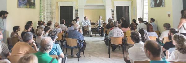 Diálogo generado entre los profesores D. Rafael Manzano (catedrático de arquitectura y miembro de la Real academia de San Fernando), D. Manuel Vigil-Escalera (Arquitecto y Profesor de Paisajismo en la ETSAS), D. Juan Lacomba (Artista, historiador y miembro de la Real Academia de Bellas Artes de